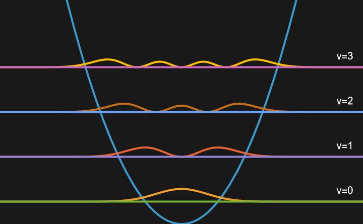 Here we can see that the probability of finding the particle extends beyond the bounds of our potential, unlike in the Particle in a Box. This is because the potential energy is not infinite, but depends on the height of the potential well. This is elucidated by noting that probability densities of lower values of \(v\) extend further past the potential than those with higher values of \(v\).