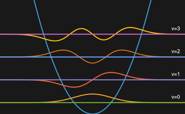 Here, we see that when the quantum number \(v\) is equal to zero, the system still has energy; this is known as the zero-point energy and it is a stark contrast to the Particle in a Box quantized energy, wherein the quantum number \(n\) could not be equal to zero. Additionally, we can see that the spacing between energy levels is constant, since as \(v\) increases, \(E_{v}\) will increase linearly. This is also different than the PIB energy, where there was a square dependence on the quantum number \(n\) and the spacing between energy levels increased.